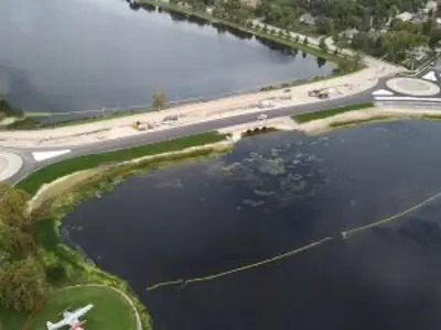 | 2021-10-18 | Started removing rock from the temporary causeway to start shaping for landscaping and installing curbs and concrete islands on the south and the north side of roundabouts. | |