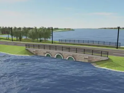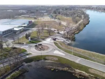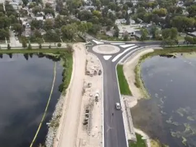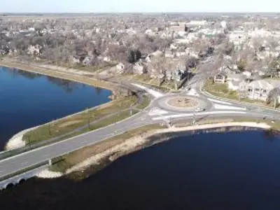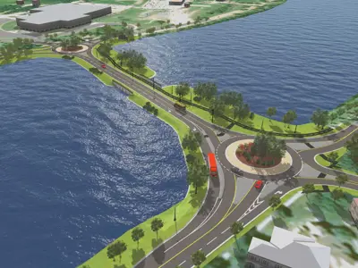 The Island Park Causeway is a three-lane low level causeway with a culvert structure, including roundabouts at the north and south intersections, and an active transportation pathway. The roundabouts have been designed to accommodate truck movements in all directions.