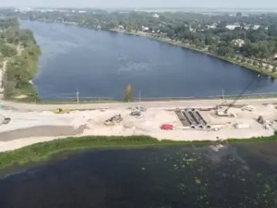 | 2019-06-03 | Started widening the gravel roadway on the temporary causeway to two lanes with a pedestrian path in advance of the bridge being torn down. | |