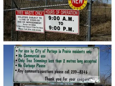 The Tree Disposal Site is located behind the Water Pollution Control Facility, east of River Road (PR 240), where only trees and tree trimmings may be disposed of. The site is open 9:00 am – 9:00 pm, 7 days per week. The tree disposal site is for use by City of Portage la Prairie residents only and not for commercial use. Only tree trimmings less than 2 meters long will be accepted. Disposal of anything other than trees (garbage, engineered wood, pressboard, metal, septic tank effluent, waste oil, etc) is strictly prohibited.