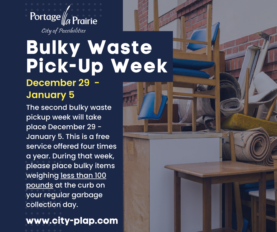 The City of Portage la Prairie’s Operations Department announces that the second free bulky waste pick-up week is coming up on December 29th, 2025 to January 5th, 2026.