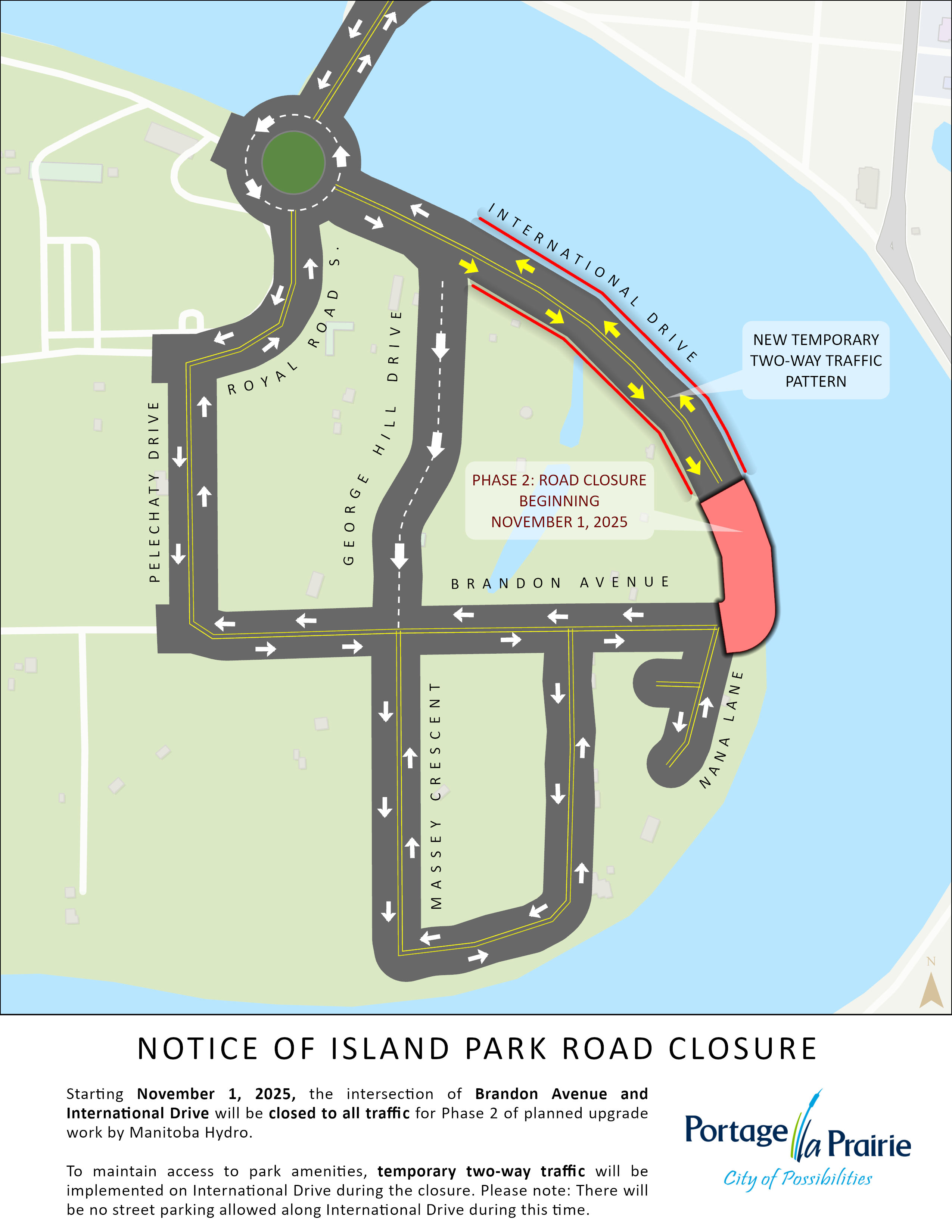 Starting November 1, 2025, the intersection of Brandon Avenue and International Drive will be closed to all traffic for Phase 2 of a planned upgrade work by Manitoba Hydro.