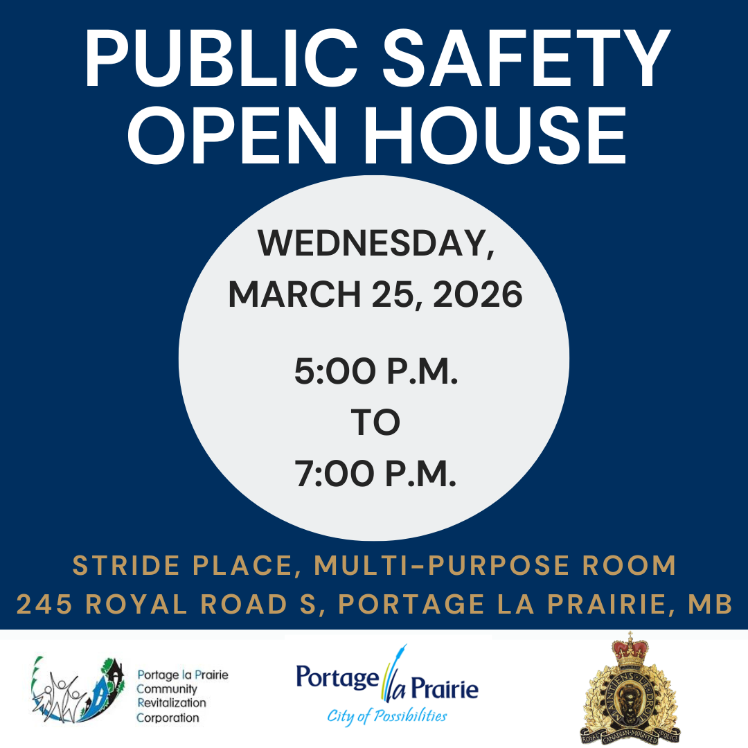 The City of Portage la Prairie, the Portage la Prairie Community Revitalization Corporation and the RCMP invite you to join us for a Public Safety Open House.